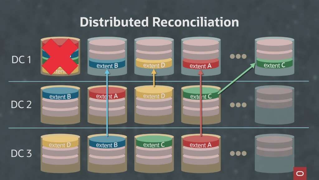 높은 내구성을 달성하려면 장애 감지 및 복구 기간을 최소화하여 동시 장애 가능성을 최소화해야 합니다. 20TB 디스크 복사는 디스크 읽기/쓰기 대기 시간으로 인해 약 하루가 걸립니다. Object Storage는 디스크 장애를 감지하고 30분 이내에 디스크 장애를 복구합니다. 장애가 발생한 한 디스크의 데이터를 교체 디스크에 복사하는 대신 여러 데이터 센터에 걸쳐 별도의 서버에 있는 별도의 디스크에 데이터를 병렬로 복사합니다. 이 방법을 분산 조정이라고 합니다. 여러 데이터 센터가 있는 클라우드 규모 지역에서는 자동화된 분산 조정을 사용하여 디스크 장애로부터 신속하게 복구할 수 있습니다. 그림은 분산 조정 프로세스를 보여줍니다.
