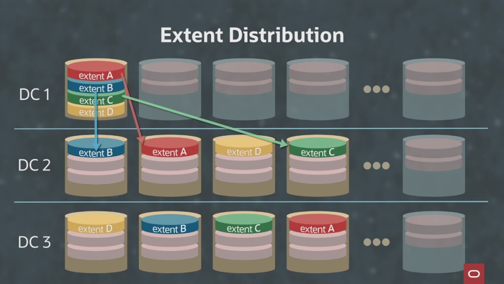 Object Storage는 동일한 객체에 대해 3–5개의 동시 디스크 오류를 허용하도록 설계되었습니다. 그림은 데이터가 익스텐트로 나뉘고 DC1의 첫 번째 디스크에 있는 데이터가 별도의 데이터 센터에 있는 별도의 서버에 있는 별도의 디스크에 분산되는 방식을 보여줍니다.