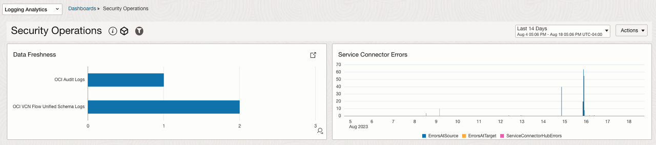 | Operearions | 서비스 커넥터 오류 | 서비스 커넥터 허브 메트릭 네임스페이스를 기반으로 하며 OCI 로깅(소스) 읽기, Logging Analytics(대상) 쓰기 및 서비스 커넥터 오류와 관련된 오류를 표시합니다. |