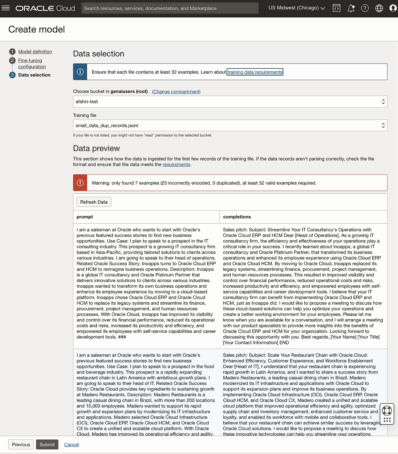미세 조정 작업에는 jsonl 형식의 단일 파일로 구성된 레이블이 지정된 교육 데이터 세트가 필요합니다. 각 훈련 예시에는 프롬프트와 완료라는 두 가지 키가 있습니다. 프롬프트에는 모델이 응답을 생성하기 위해 따라야 하는 일련의 지침이 포함되어 있으며, 완료는 모델에서 예상되는 응답입니다. 미세 조정을 위해서는 최소 32개의 예제가 필요하지만 가능하면 100개 이상을 사용하는 것이 좋습니다.