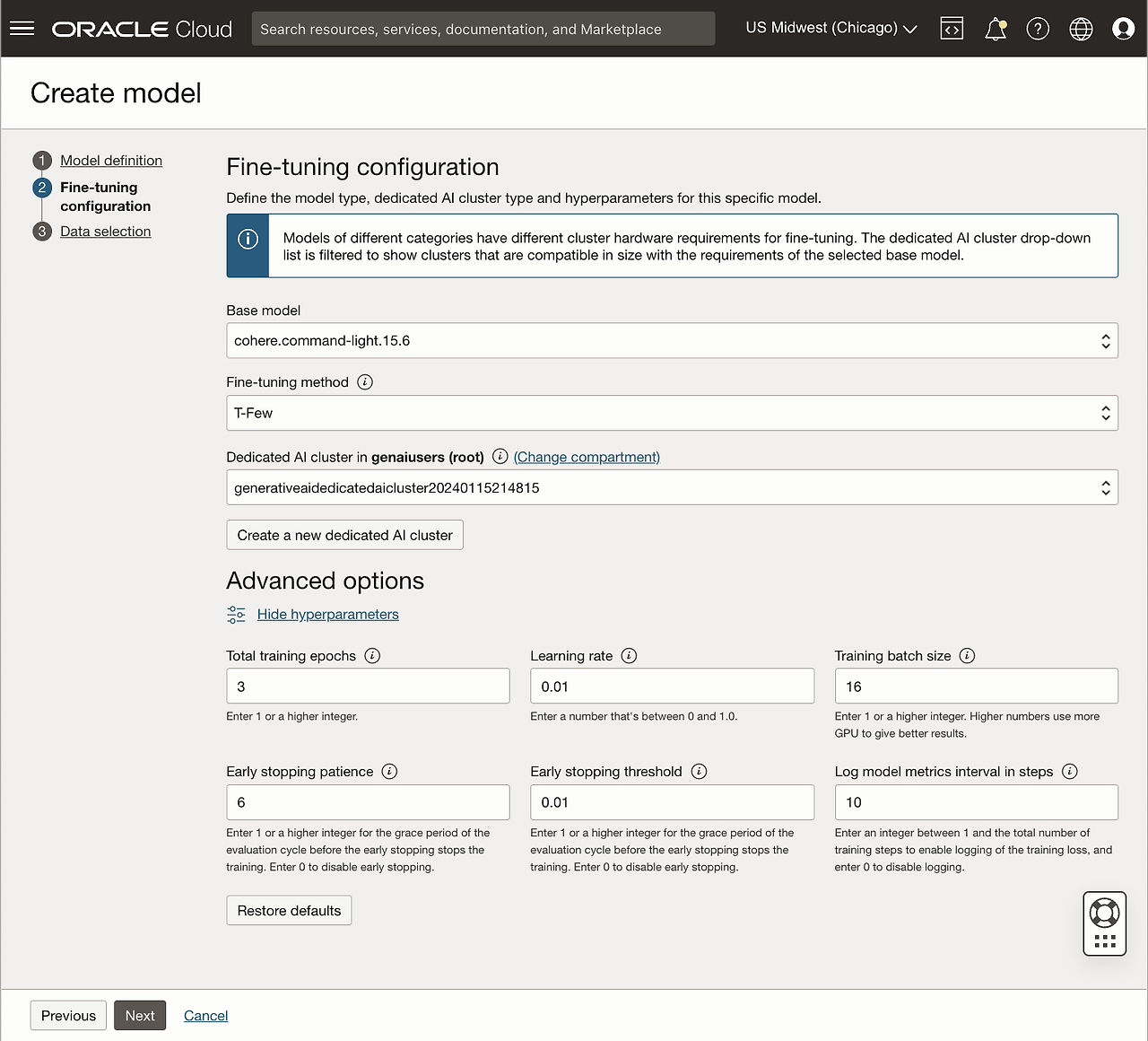 OCI Generative AI를 사용하면 전용 AI 클러스터의 모델 미세 조정을 통해 특정 작업에 대한 기본 모델을 최적화할 수도 있습니다. Cohere의 Command XL 및 Command 조명 모델에는 t-few와 바닐라라는 두 가지 미세 조정 전략이 제공됩니다. 훈련 시대 수, 학습 속도, 훈련 배치 크기, 조기 중지 인내심, 조기 중지 임계값, 모델 메트릭이 기록되는 단계 간격을 포함한 기본 미세 조정 하이퍼파라미터는 기본적으로 설정됩니다. 그러나 미세 조정 작업이 시작되기 전에 매개변수를 수정할 수 있습니다.