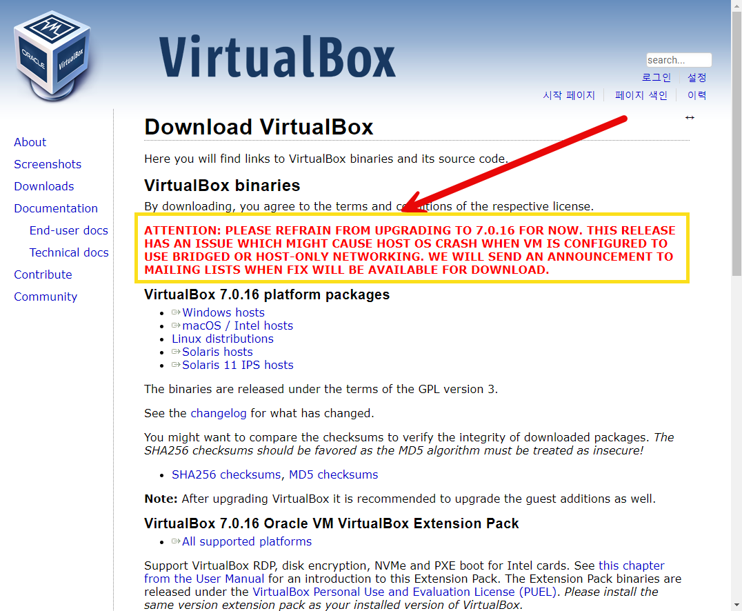 버추얼박스 7.0.16이 며칠전 릴리즈 되었는데, 초기 설치는 문제가 아닌데, 기존 버전을 설치했다가 이번에 업그레이드를 하는 분들은 당장은 업그레이드를 권장하지 않습니다.