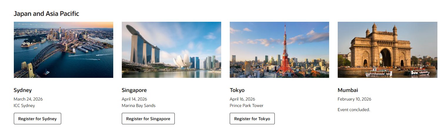 Join us for complimentary one-day events around the globe. Hear the latest breakthroughs in AI-powered cloud applications, databases, and infrastructure from experts, partners, Oracle executives, and local business leaders.
