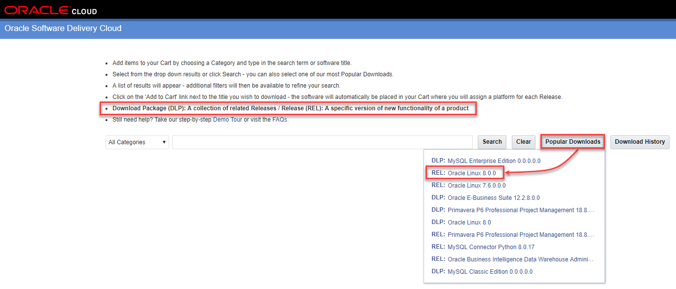 오라클 소프트웨어 딜리버리 클라우드 페이지내로 진입하게 되면 아래와 같이 프로그램을 검색하여 다운로드 할 수 있도록 도와 줍니다.