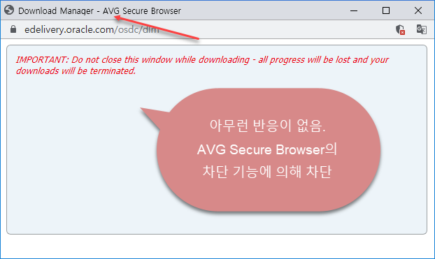 이 부분은 예상치 못한 이슈 였는데 , 제가 다운로드 받던 환경은 인텔의 2세대 i5 , 윈도우 10이 설치된 테스트용 데스크탑이었는데, AVG 안티 바이러스를 평가판으로 설치해 두었는데 , 해당 AVG Secure Browser (크롬 브라우져 클론 배포판)에서 Download Manager 를 차단하여 더 이상 다운로드가 진행되지 않는 문제가 발생되어 결국은 파이어폭스로 변경하여 진행하였습니다.
