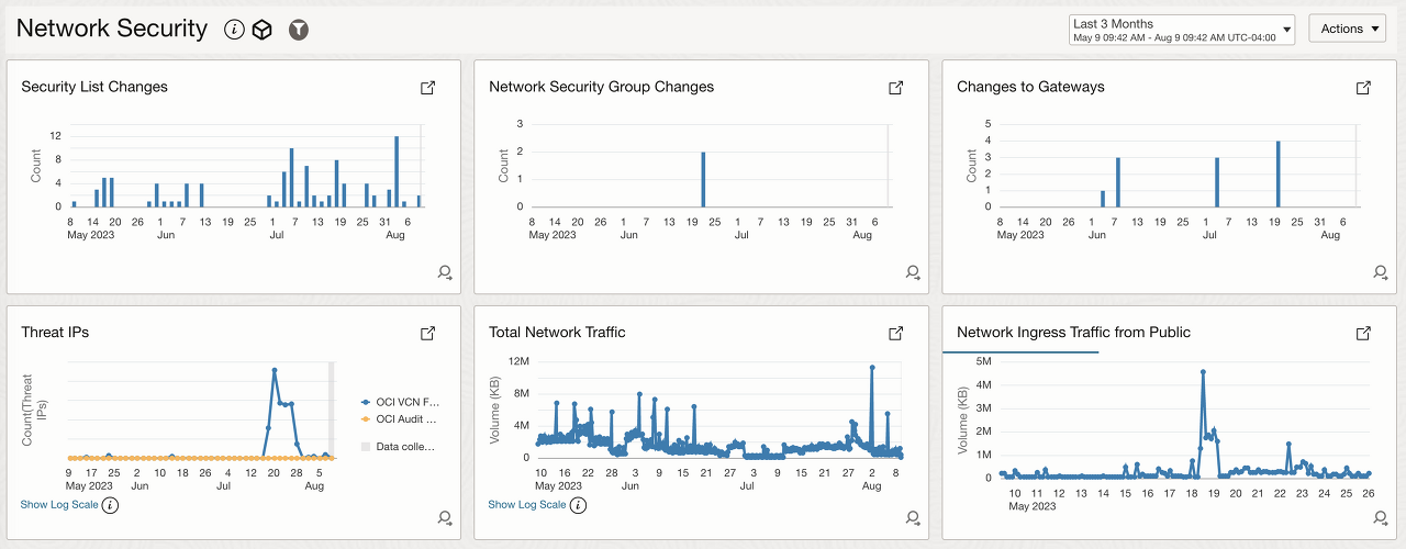이제 보안 기본 대시보드가 OCI 테넌시의 보안 위협과 문제를 감지합니다. 예를 들어, OCI 클라우드 리소스에 액세스하는 VCN 흐름 로그에서 탐지된 위협 IP 또는 공용 IP의 네트워크 수신 트래픽에서 스파이크가 탐지된 경우 테넌시 전반에 걸쳐 보안 위험을 완화하기 위해 보안 팀의 추가 조사가 필요합니다.