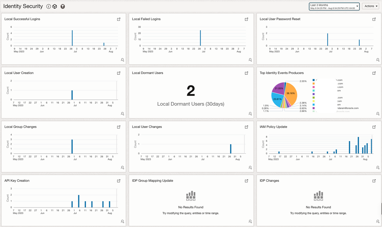 | IAM | IDP 변경 | 1일 동안 집계된 테넌시 전반에 걸쳐 성공 또는 실패한 아이덴티티 공급자 변경 횟수를 보여주는 막대 차트입니다.여기에는 IDP 생성, 업데이트, 삭제가 포함됩니다. |