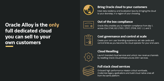 오라클은 파트너가 성공적으로 CSP(클라우드 서비스 제공업체)가 되는 데 필요한 모든 것을 제공하는 Alloy와 같은 솔루션을 보유한 유일한 하이퍼스케일러입니다. 파트너는 일반 OCI 퍼블릭 클라우드 운영에 필요한 모든 것, 즉 OCI 하드웨어와 클라우드 서비스를 제공받을 뿐만 아니라, 이를 자체 클라우드로 구축할 수 있는 기능도 제공받습니다. 파트너는 운영자용 콘솔과 최종 사용자 콘솔을 별도로 구성하여 자체 포털 환경, 청구 방식, 고객 경험을 정의할 수 있습니다. 오라클의 내부 도구와 서비스를 활용하여 부가가치 서비스 포트폴리오를 구축할 수 있으며, 오라클로부터 리전 운영 및 관리 지원은 물론 특정 지역의 시장 진출 및 도입을 위한 파트너십 지원까지 받을 수 있습니다. 이는 특히 점점 더 많은 국가에서 클라우드 서비스를 "핵심 인프라"로 정의하고 규제 변화를 초래하는 현재의 거시경제 및 정치 환경에서 더욱 중요합니다. Alloy는 파트너가 규제가 엄격하거나 주권이 강한 시장에서 클라우드 서비스를 제공할 수 있도록 하는 전략적 솔루션입니다.